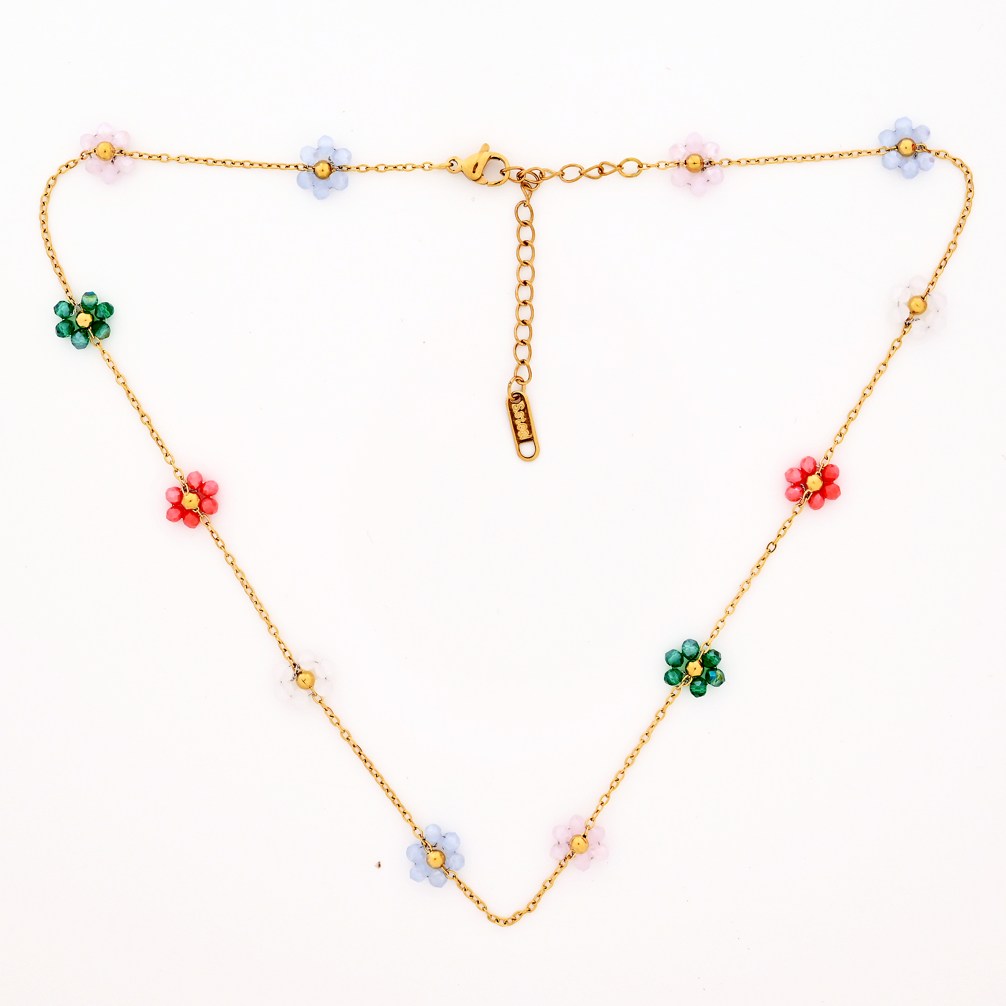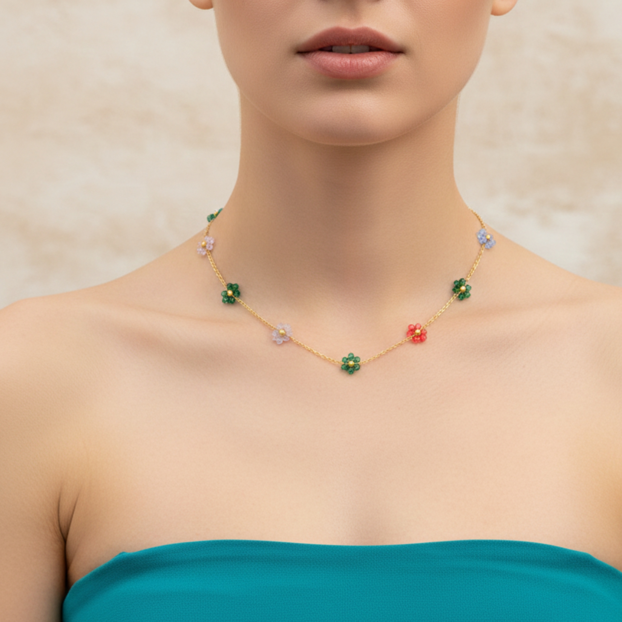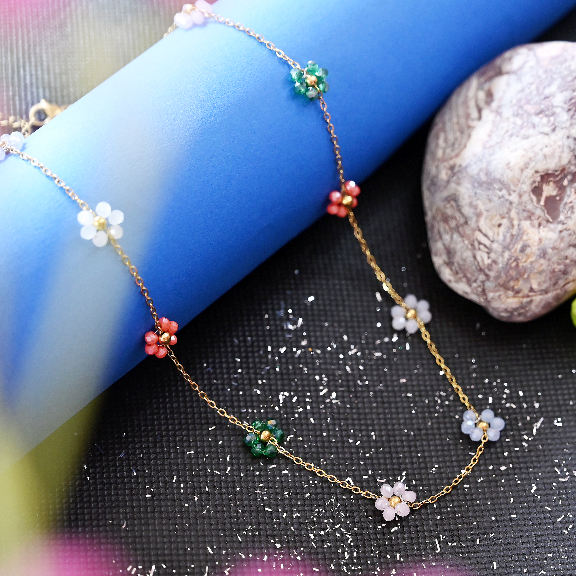 1. Charming Floral Design – Features delicate multi-colored flower beads on a gold-toned chain, symbolizing joy, love, and femininity.