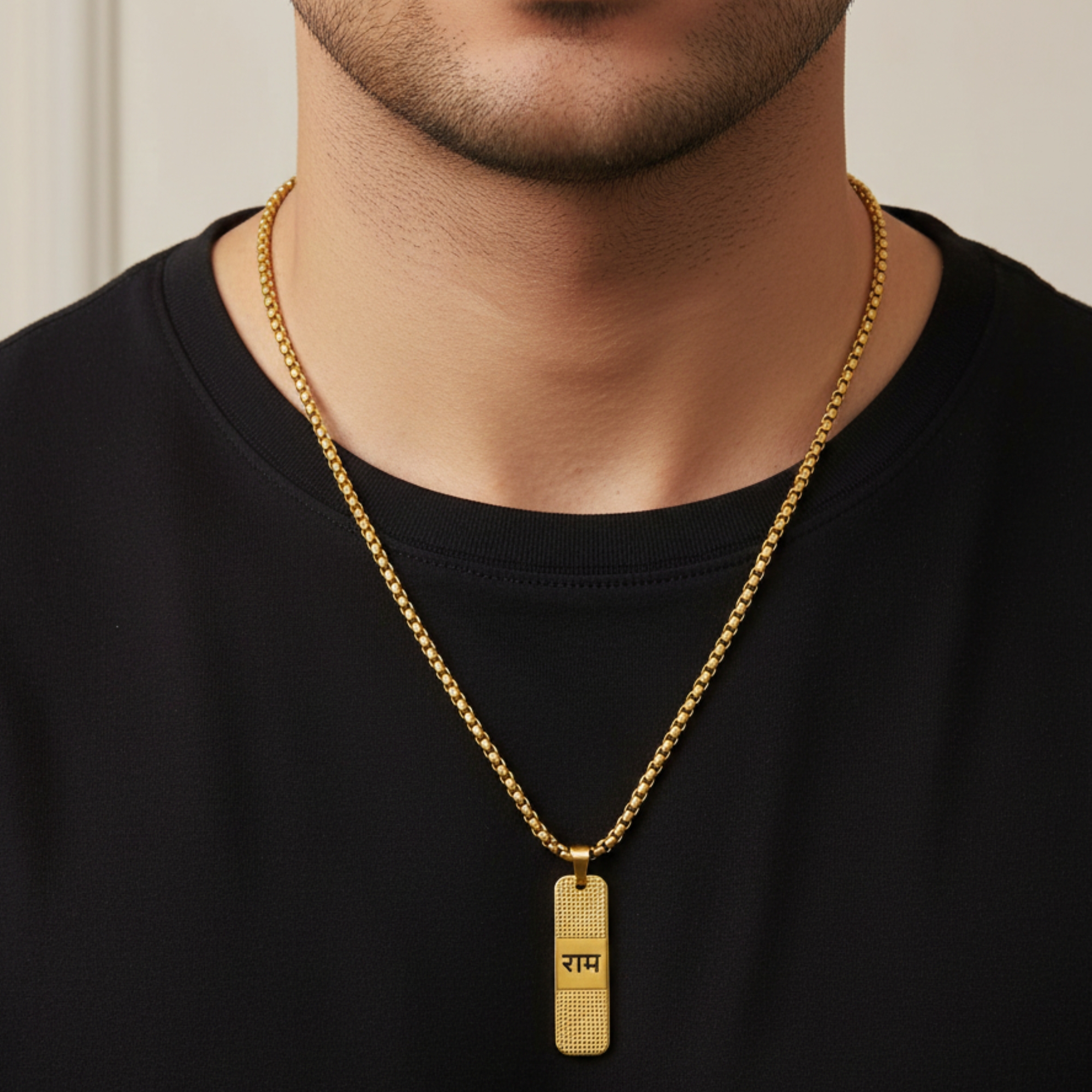 Stylish Devotional Design – A sleek vertical bar pendant engraved with “राम” that blends faith, beauty, and modern masculine style effortlessly.
