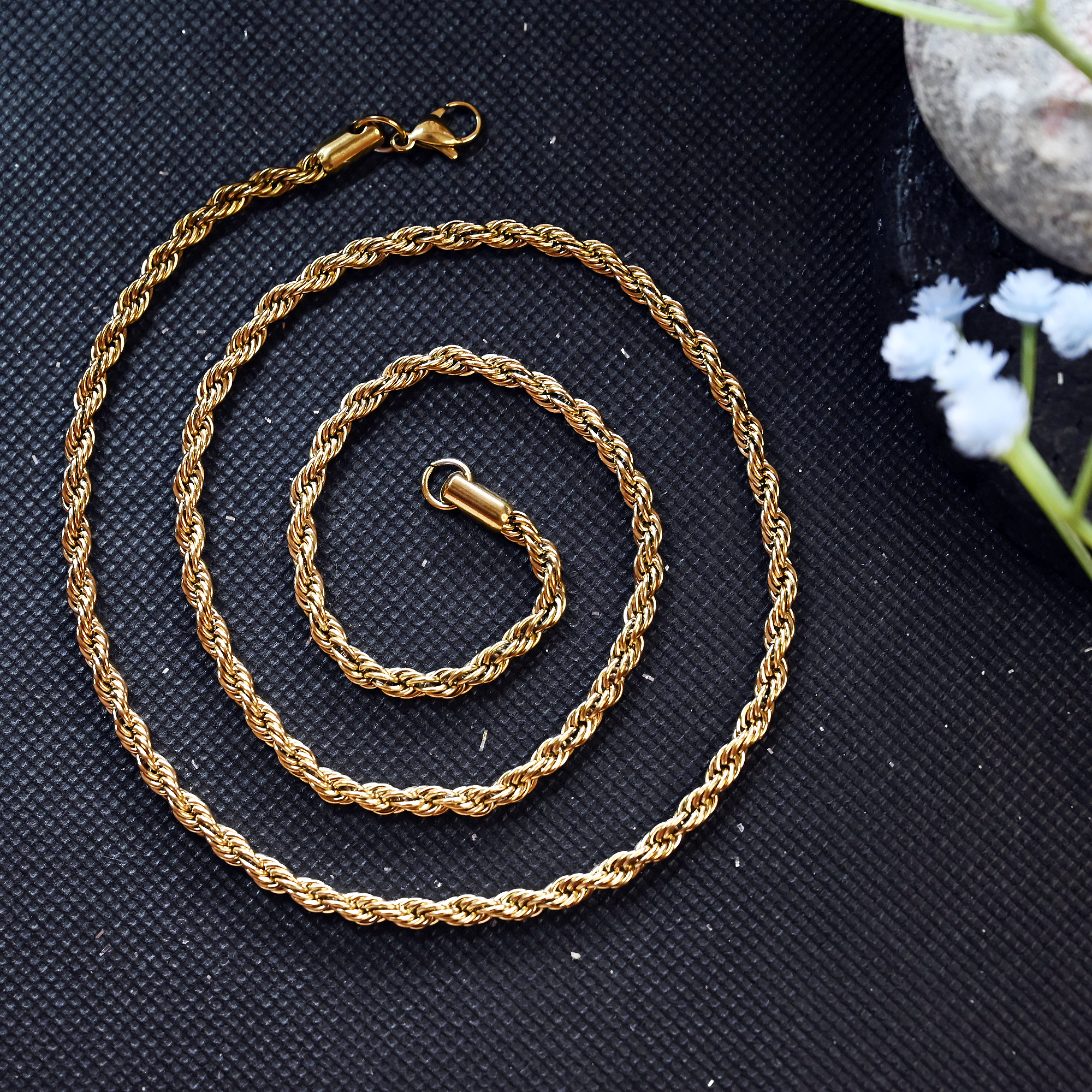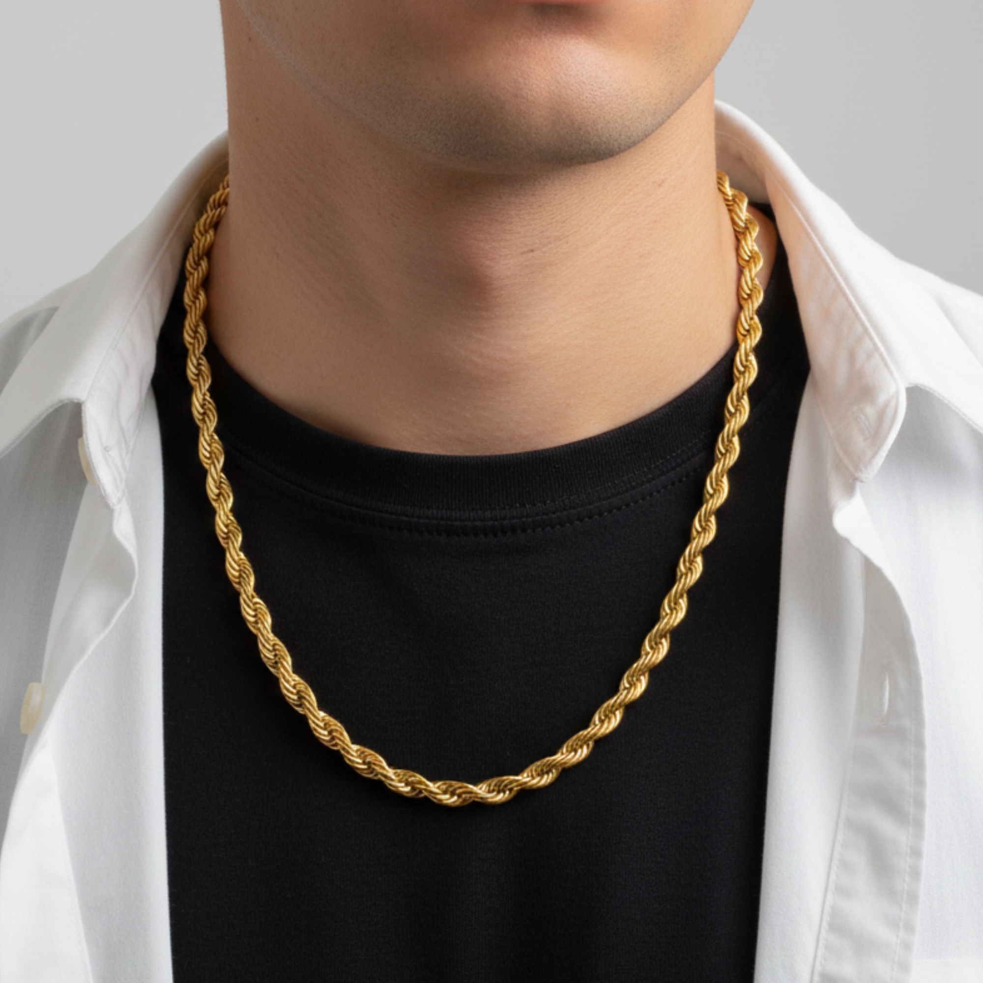 Engineered for durability and comfort, our rope chain is finished with a premium high-polish coating that resists tarnishing, ensuring it maintains its brilliant golden glow through daily wear.