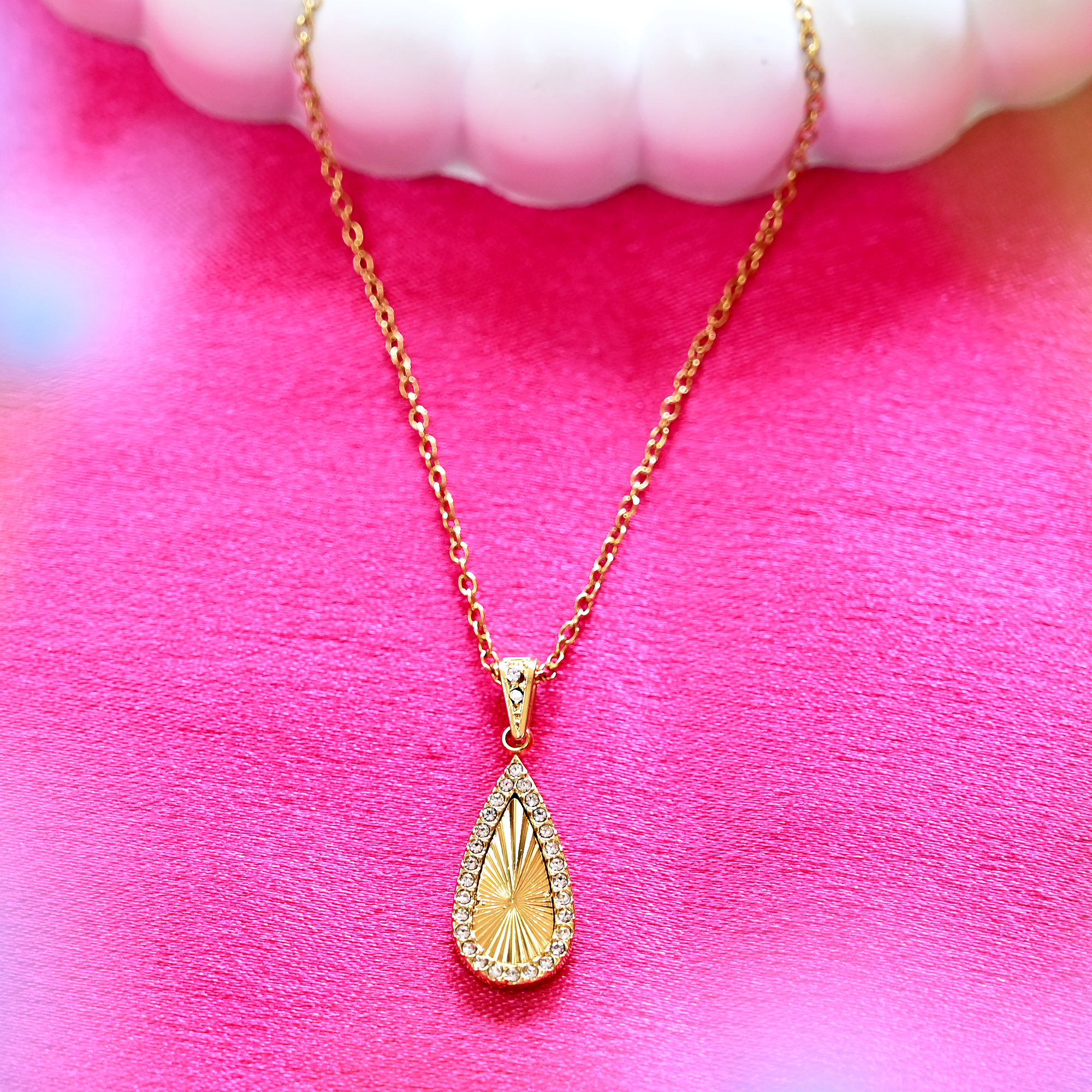 1. Graceful Teardrop Design: A symbol of elegance and femininity & this pendant features a radiant teardrop with shimmering detailing that enhances your beauty effortlessly.