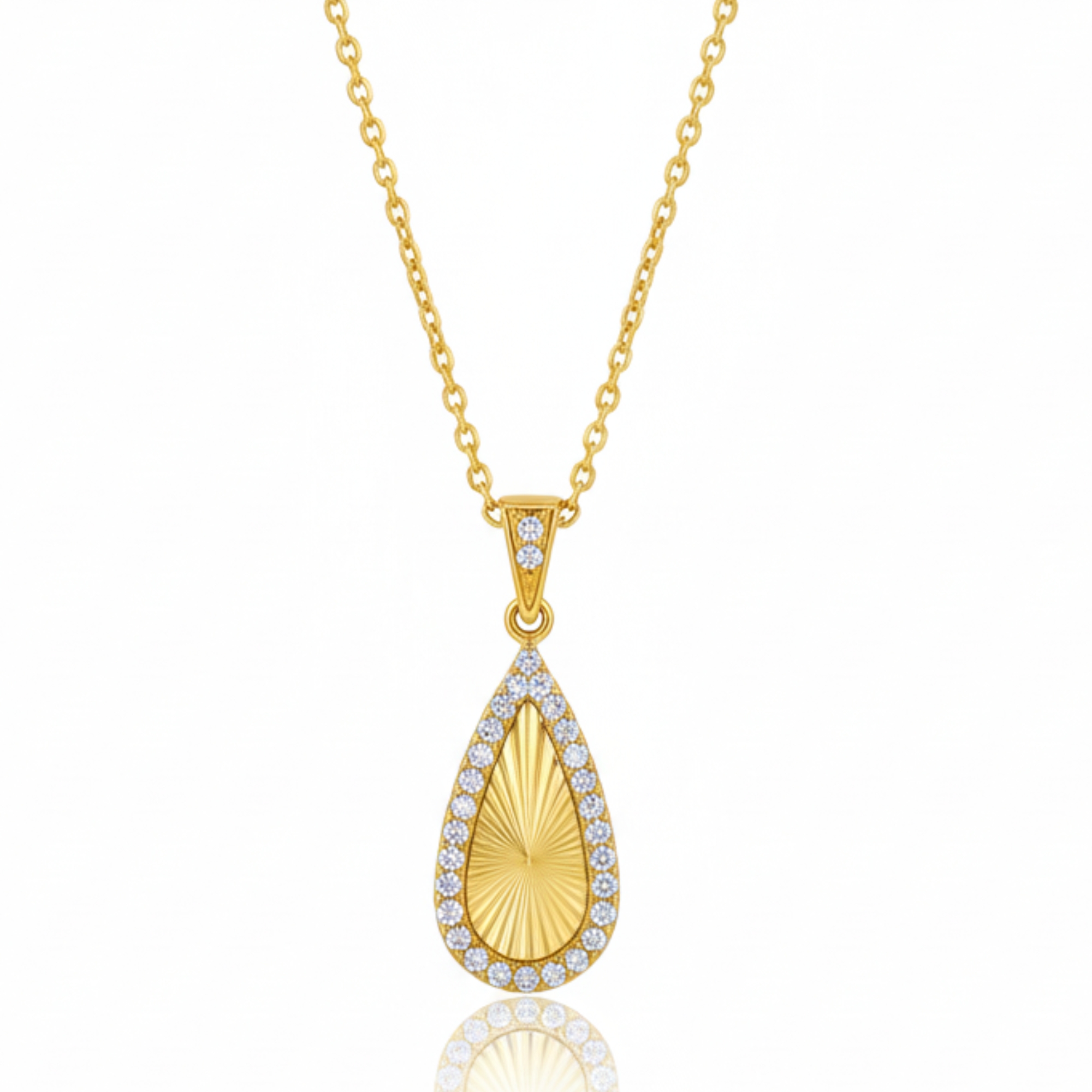 Elevate your everyday elegance with the AuraSpark  Teardrop Necklace. This exquisite piece features a unique, precision-etched sunburst center that captures and reflects light from every angle, creating a radiant glow. Encased in a shimmering halo of hand-set, brilliant-cut cubic zirconia, the pear-shaped silhouette offers a perfect blend of vintage charm and modern sophistication.