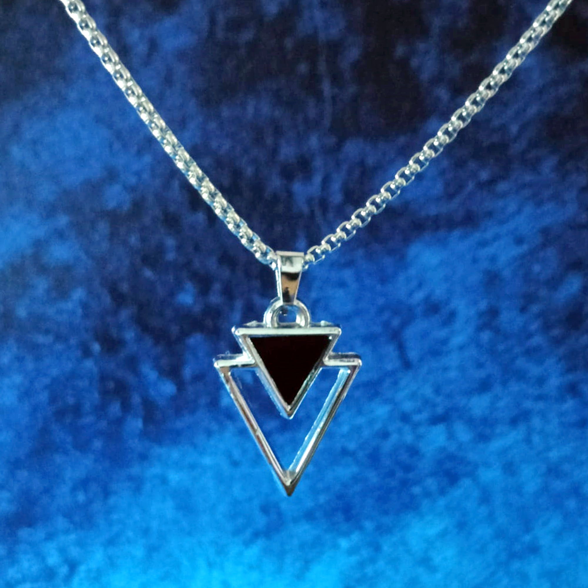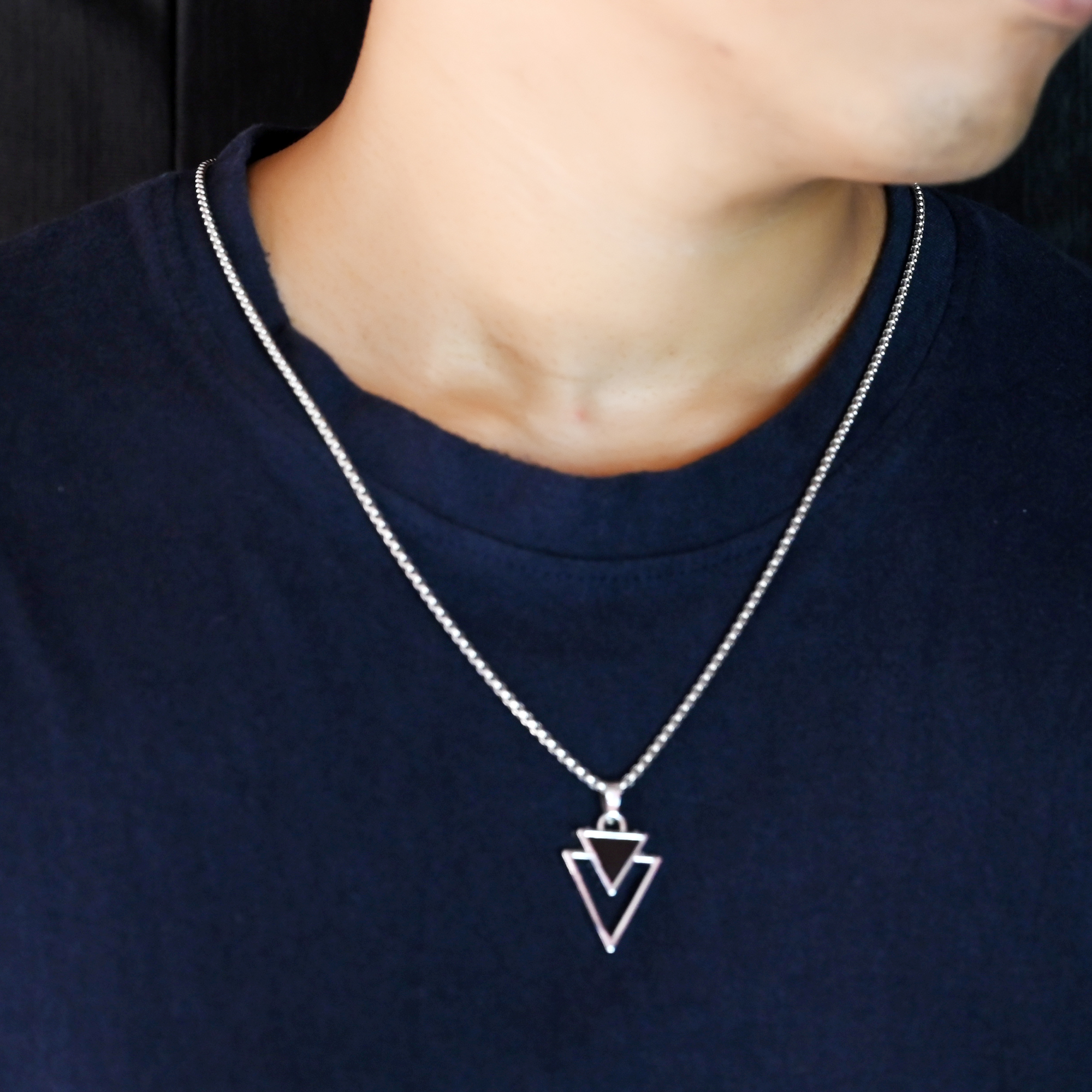 Sharp Design for the Modern Man Make a bold, geometric statement with the AuraSpark Silver Triangle Pendant. This necklace features a unique, layered double-triangle design—a sleek hollow outer frame paired with a smaller, solid jet-black enamel triangle inlay. Designed for those who appreciate architectural lines and minimalist aesthetics