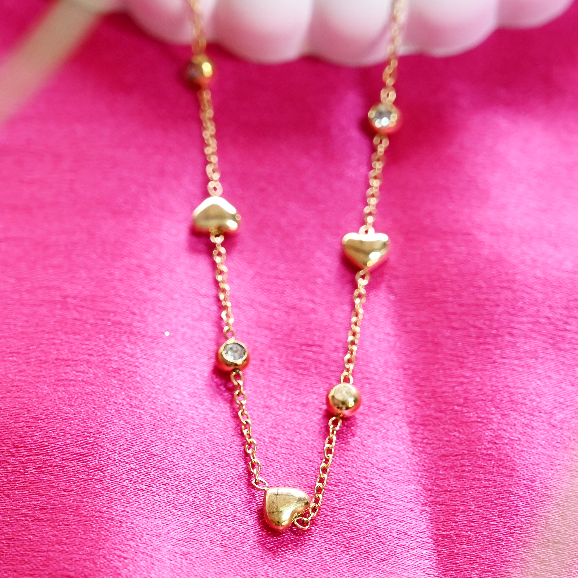 1. Charming Heart Design – Features delicate gold heart charms with crystal accents, adding a touch of romance and sophistication to any look.