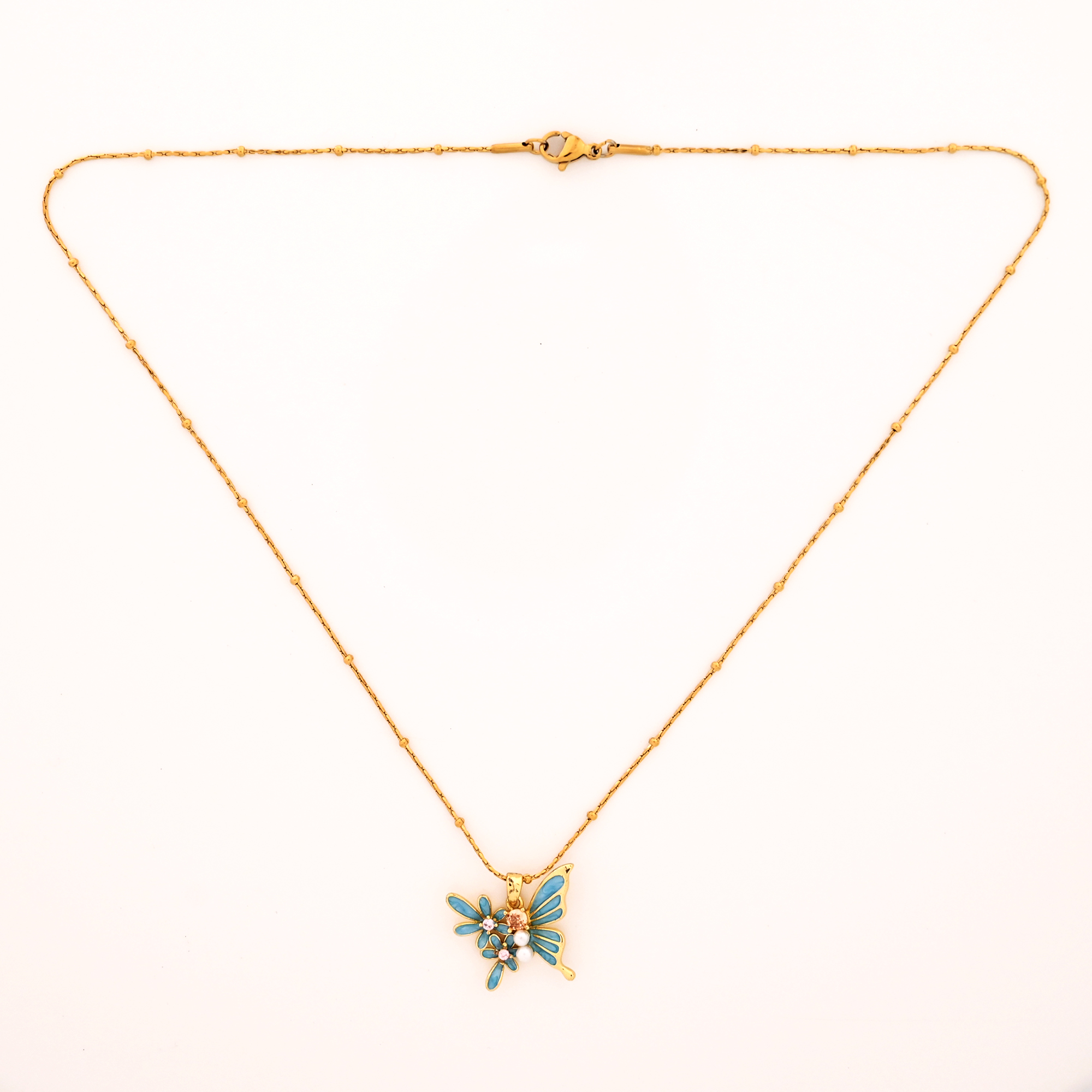 Elegant Butterfly Pendant with Blue Enamel & Pearl Design Chain for Women