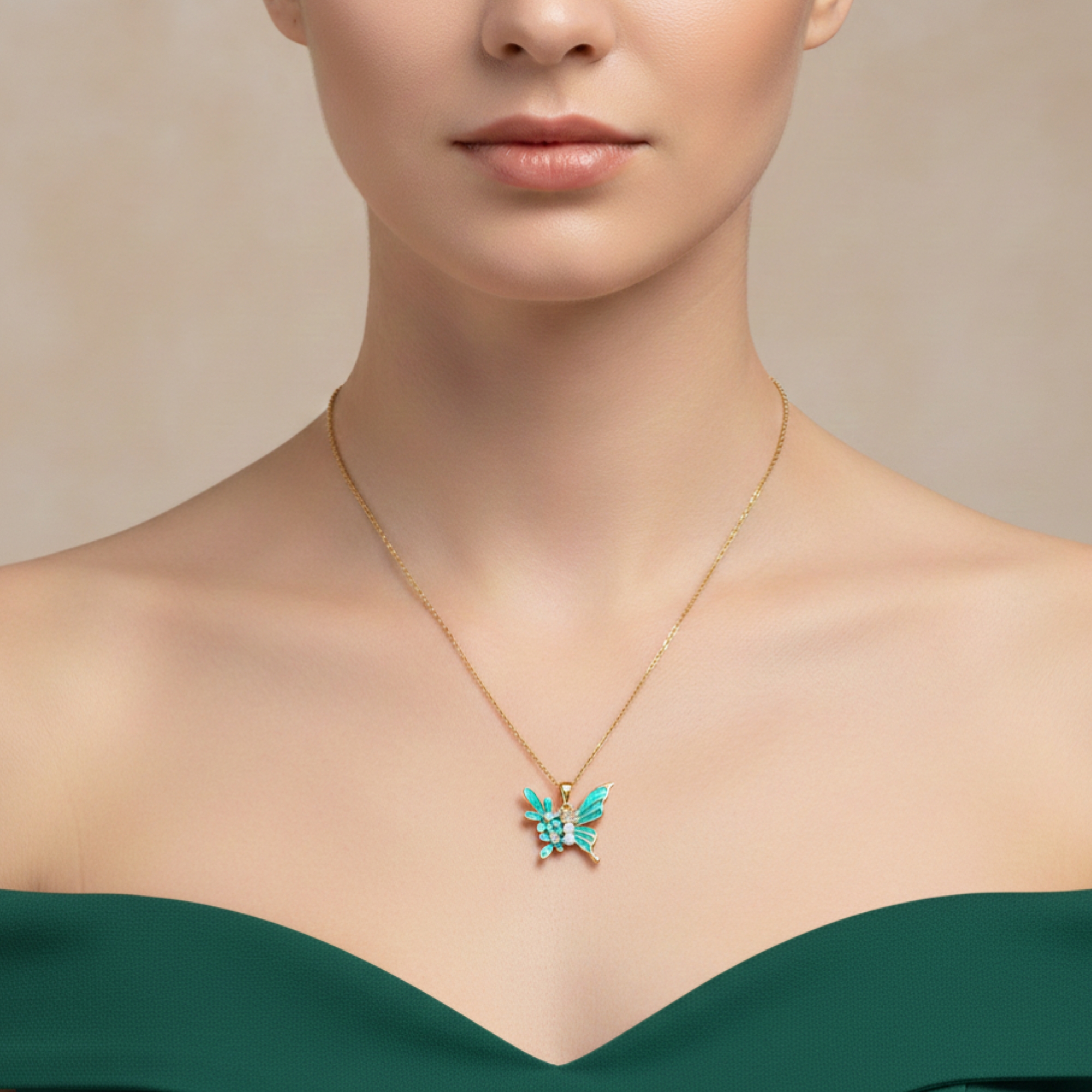 3. Elegant Enamel & Pearl Detail: The blue-green enamel wings with a delicate pearl at the center add a graceful contrast and highlight your natural charm.