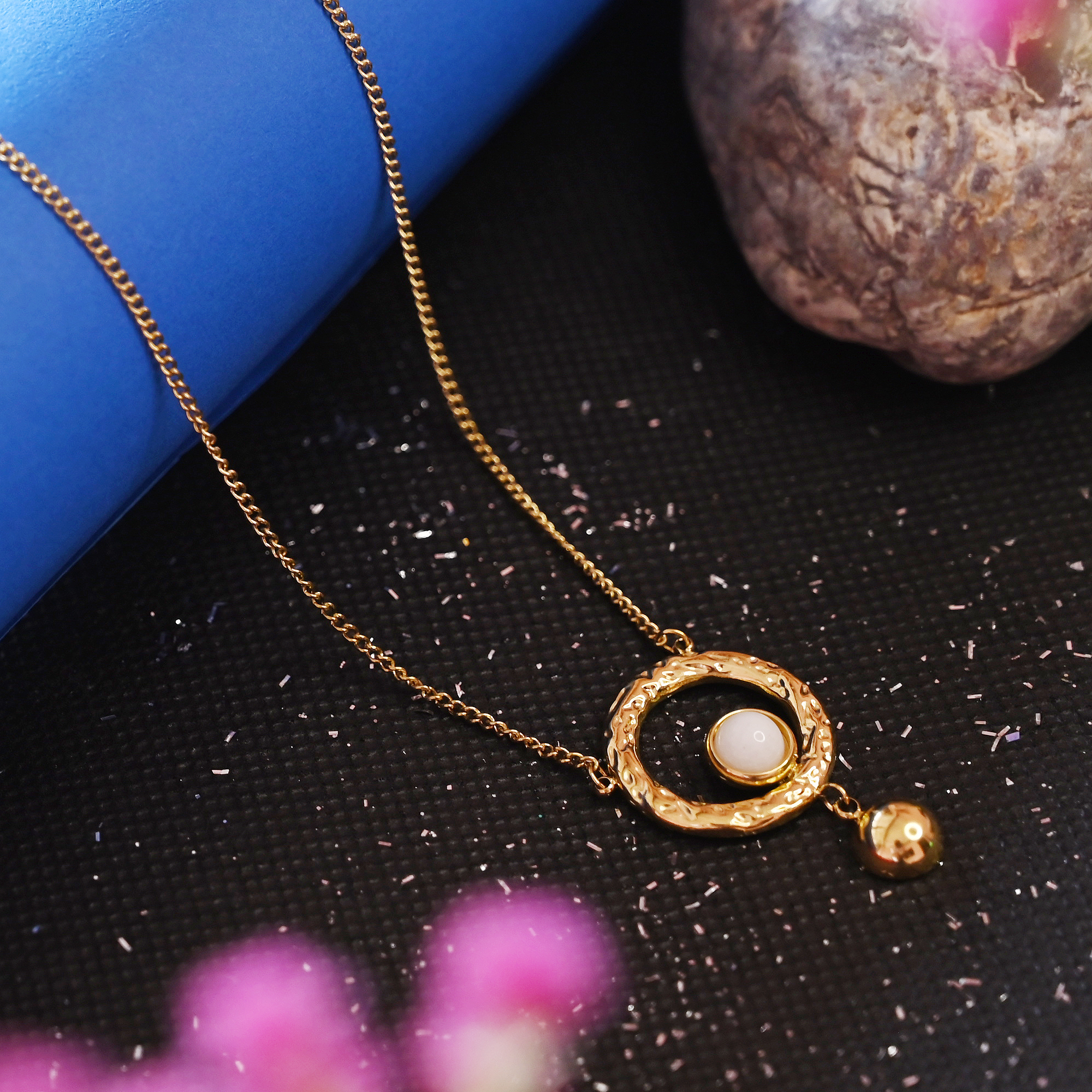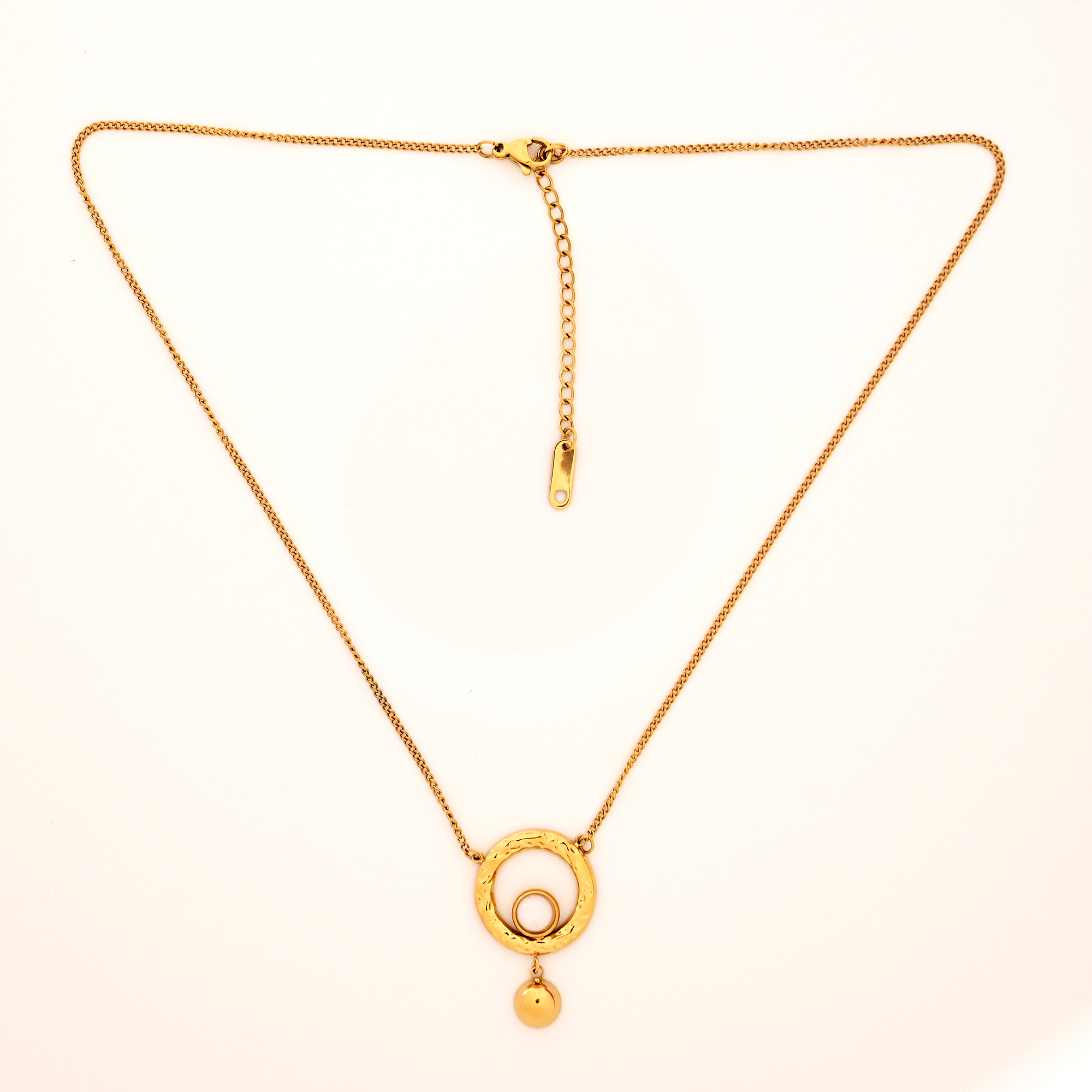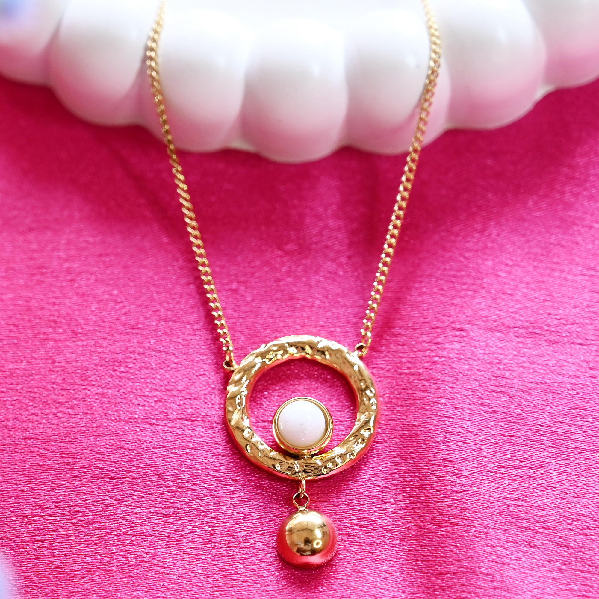 1. Elegant Modern Design – Beautifully designed gold circle pendant with a white stone center and a dangling gold bead for a touch of grace and movement.