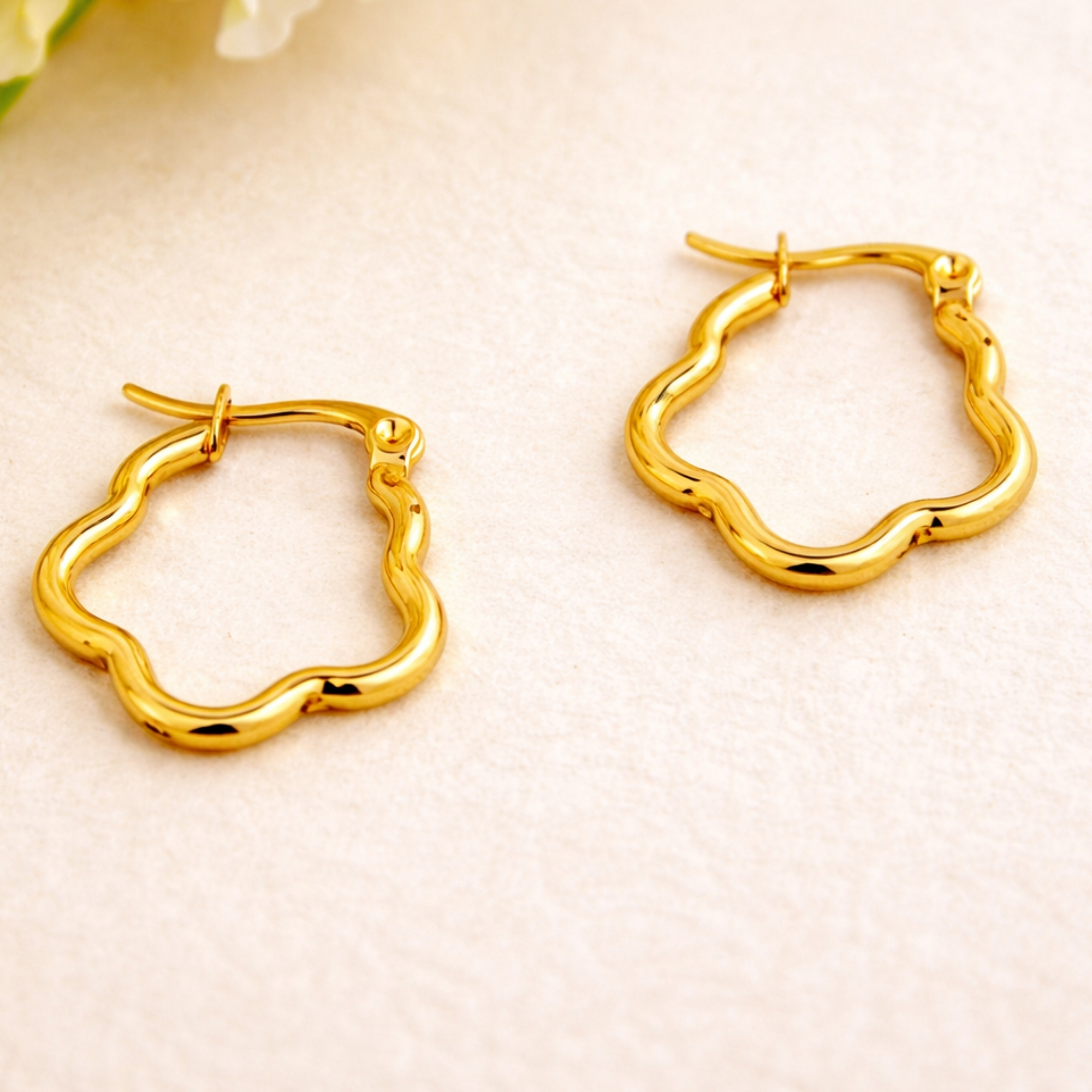 Unique Wavy Design: Features a contemporary irregular “wave” shape that puts a modern twist on the classic gold hoop earring.
