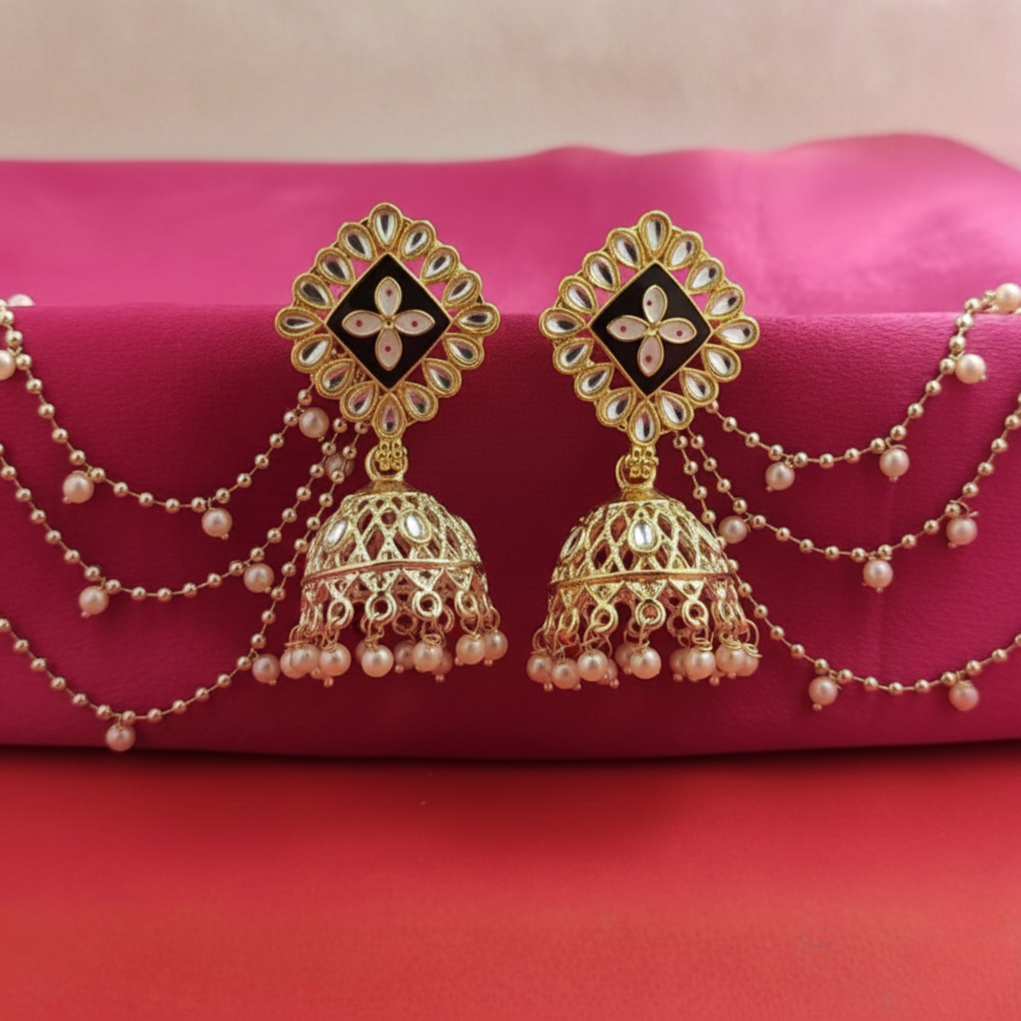 Featuring a vibrant maroon enamel base adorned with a floral Kundan motif, the jhumkas are finished with delicate pearl droplets that dance with every movement.