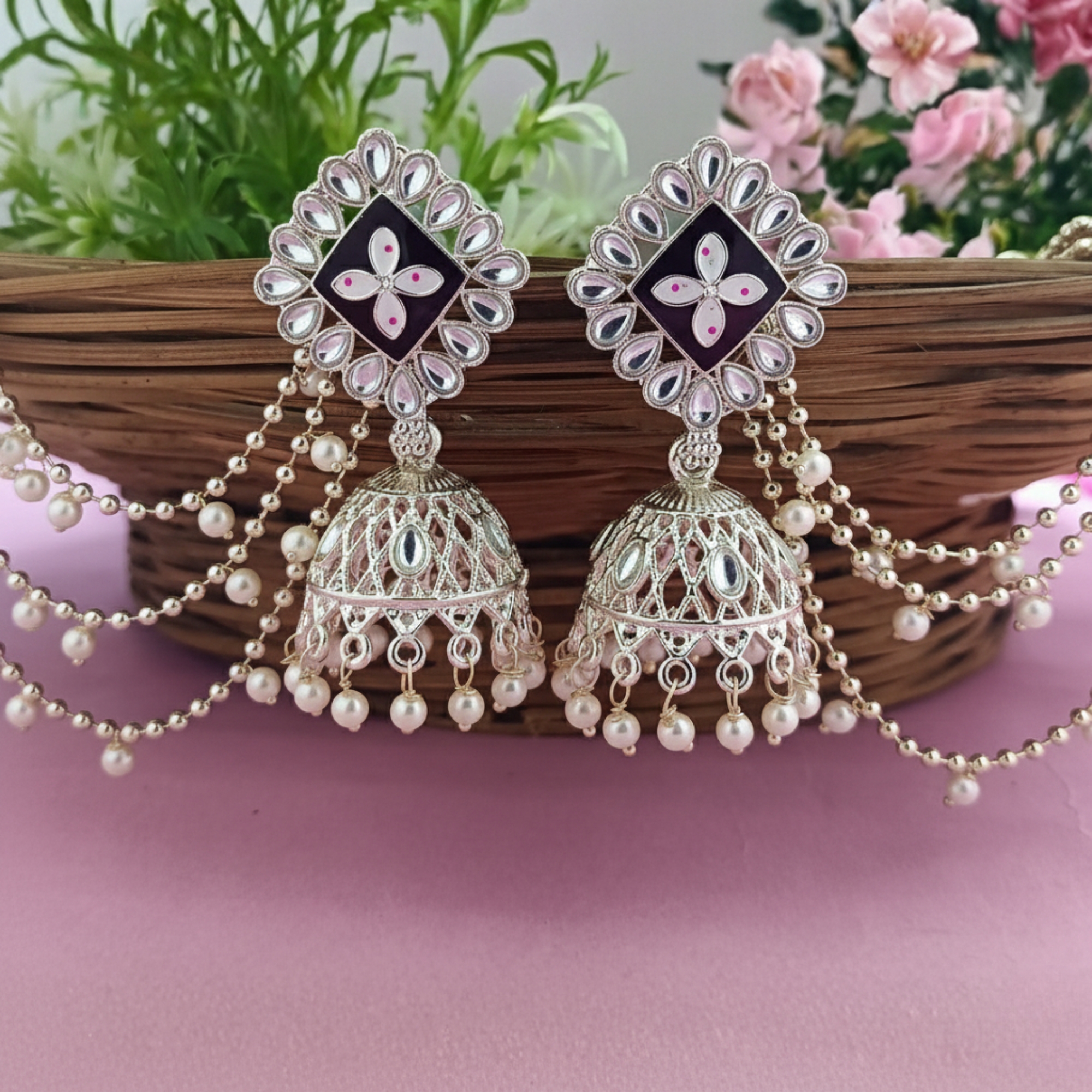 Be the first to review “Elegant Silver Kundan Jhumka Earrings with Ear Chain, Pearl & Beads”