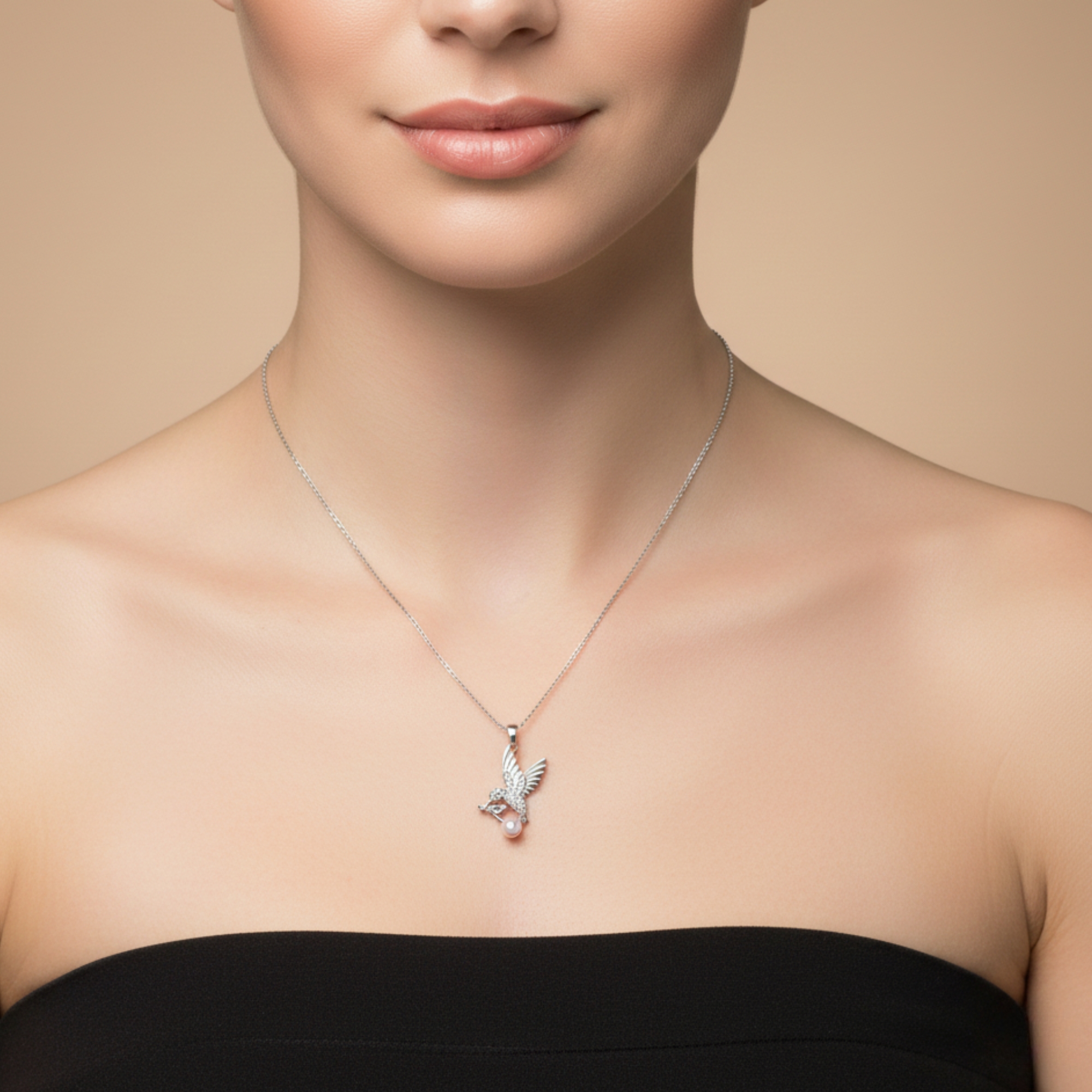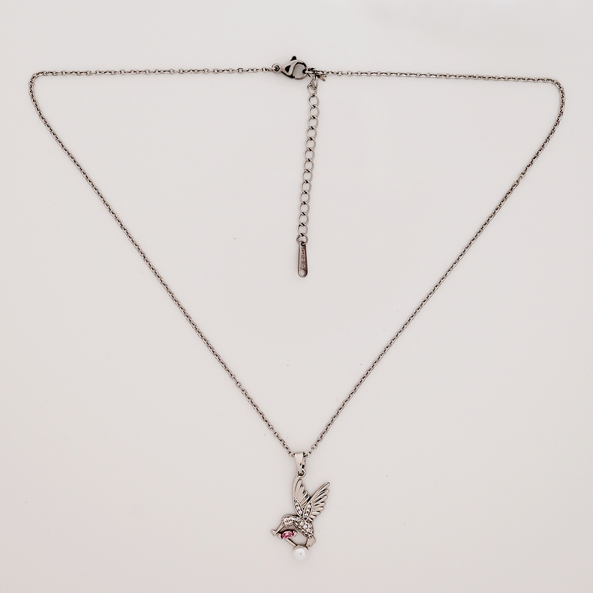 Elegant Silver Tone humming Bird with Pearl Necklace for Women