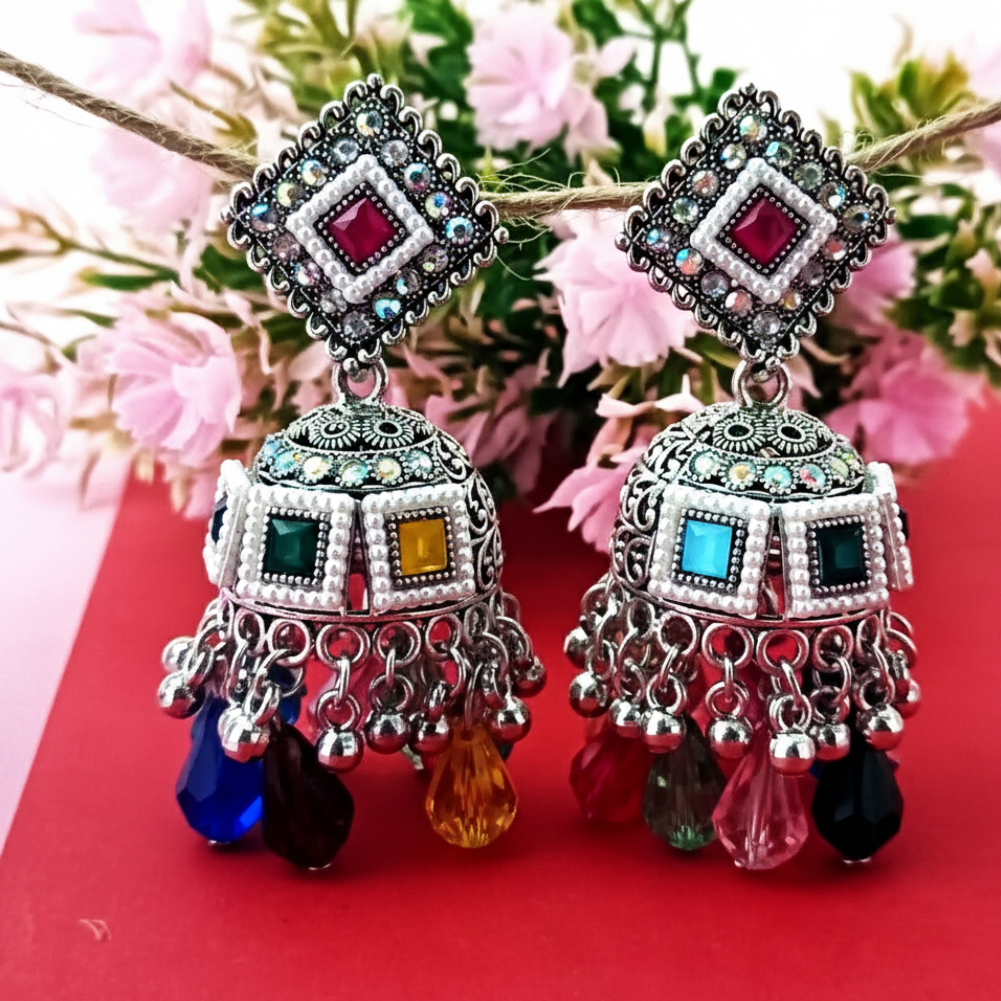 Intricate Craftsmanship: Features a classic floral stud and a bell-shaped Jhumka with detailed silver engraving.