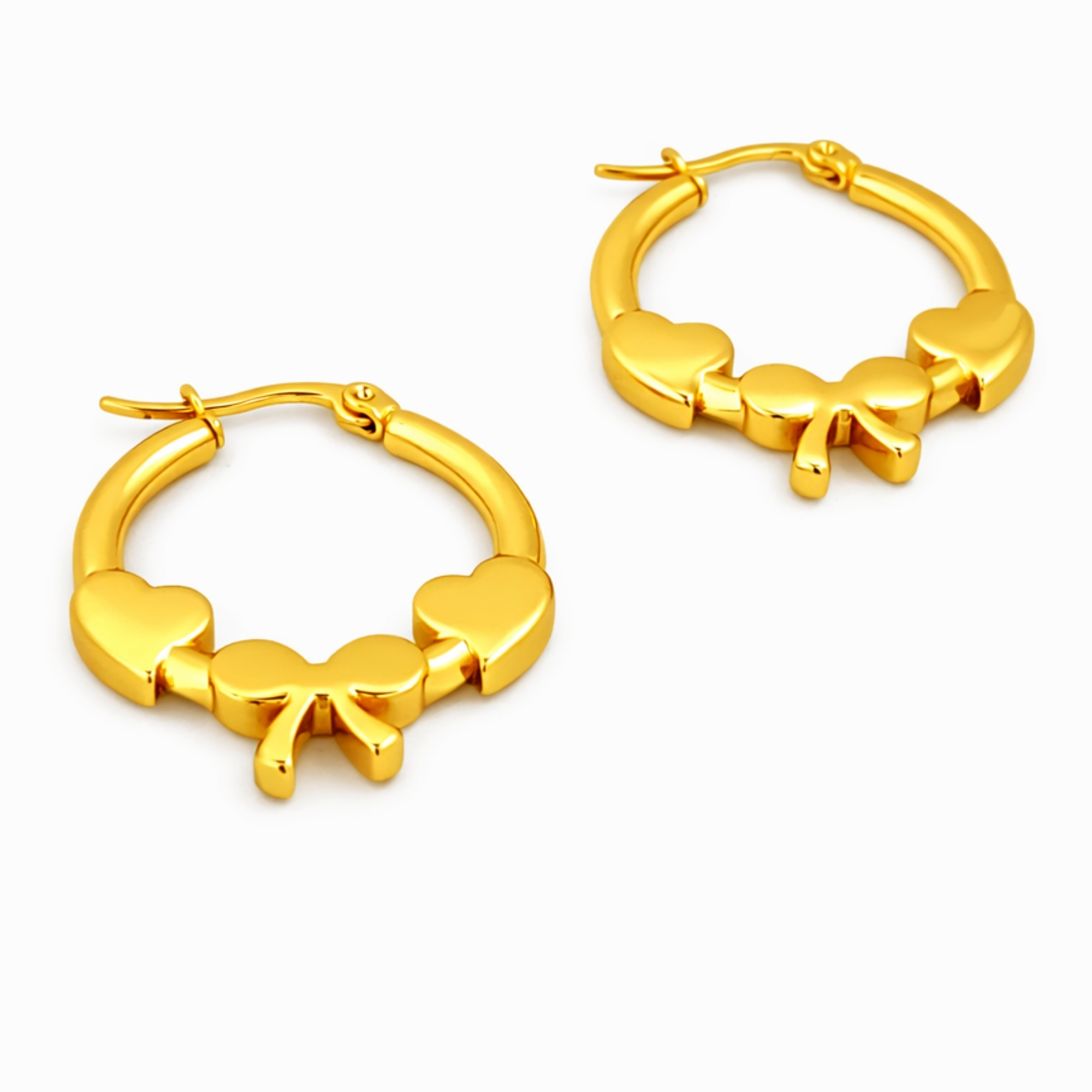 Elevate your everyday style with the AuraSpark Heart and Bow Charm Hoop Earrings. Designed for the modern romantic, these exquisite hoops feature a polished gold finish that radiates warmth and sophistication. Each earring is adorned with two smooth, minimalist hearts flanking a delicate central bow, creating a playful yet elegant silhouette.