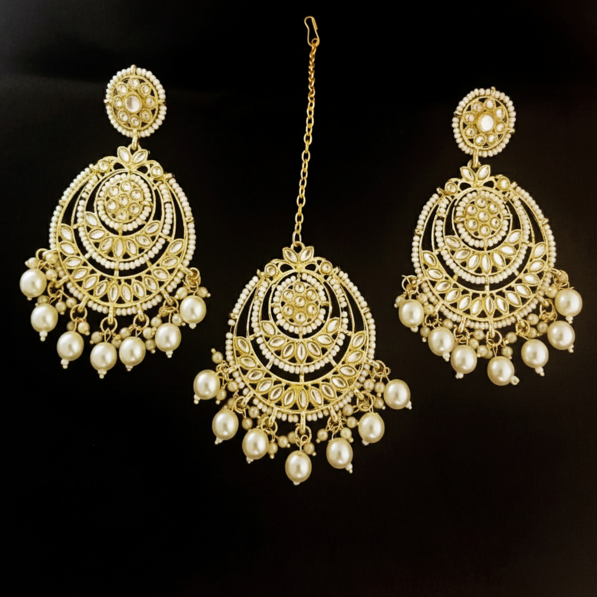 Complete Ethnic Set: Includes one pair of heavy chandelier earrings and a matching Maang Tikka for a coordinated bridal or festive look.