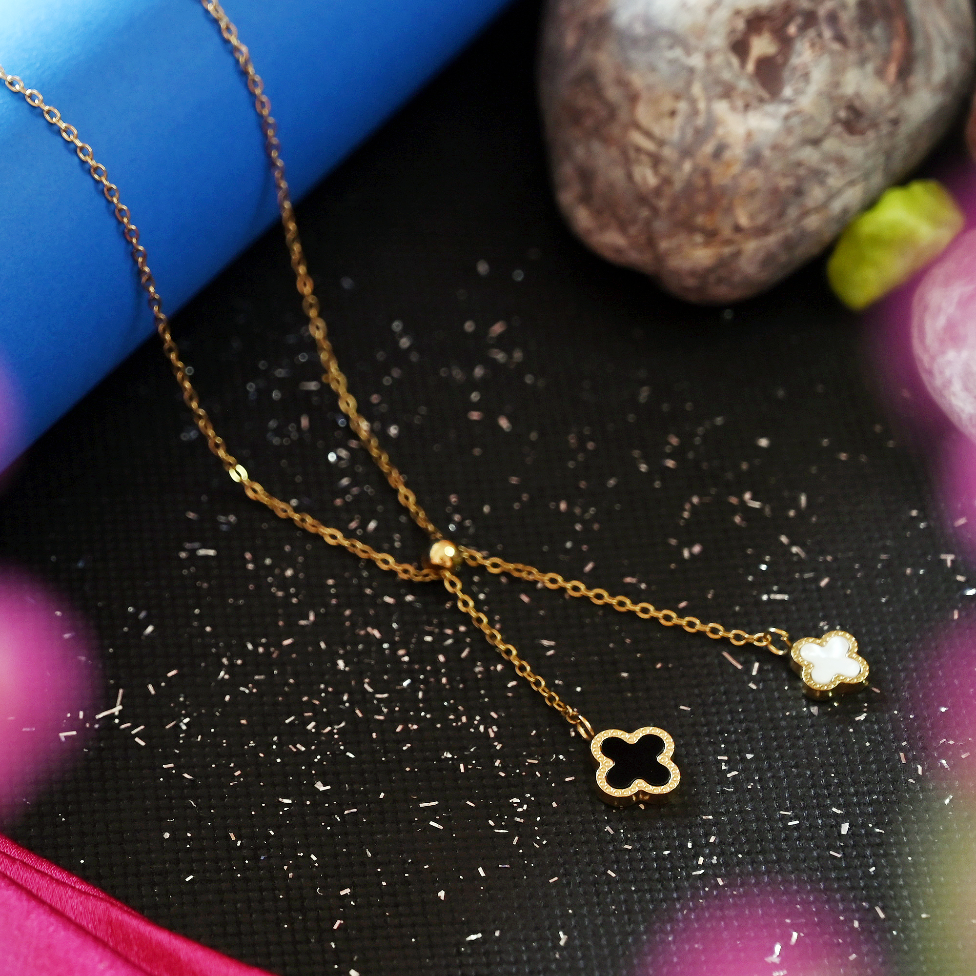 1. Elegant Dual Clover Design: A symbol of beauty and luck, featuring black and white four-leaf clovers that reflect grace and balance and must-have for women who love timeless charm.