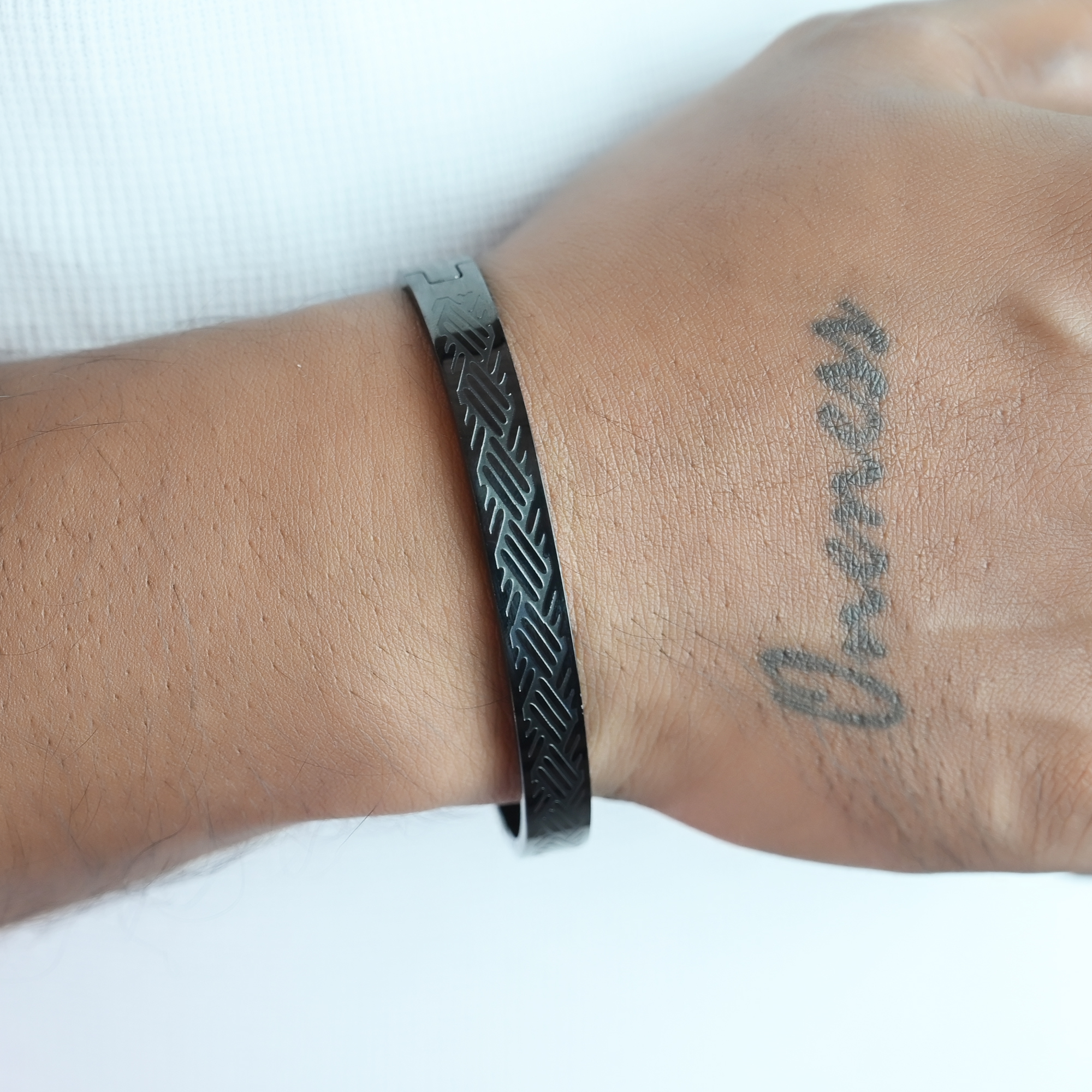 Elevate your wrist game with the AuraSpark Matt Black Kada Bracelet. Designed for the modern man who balances grit with sophistication, this bracelet features a precision-etched tire-tread pattern that symbolizes strength and momentum.