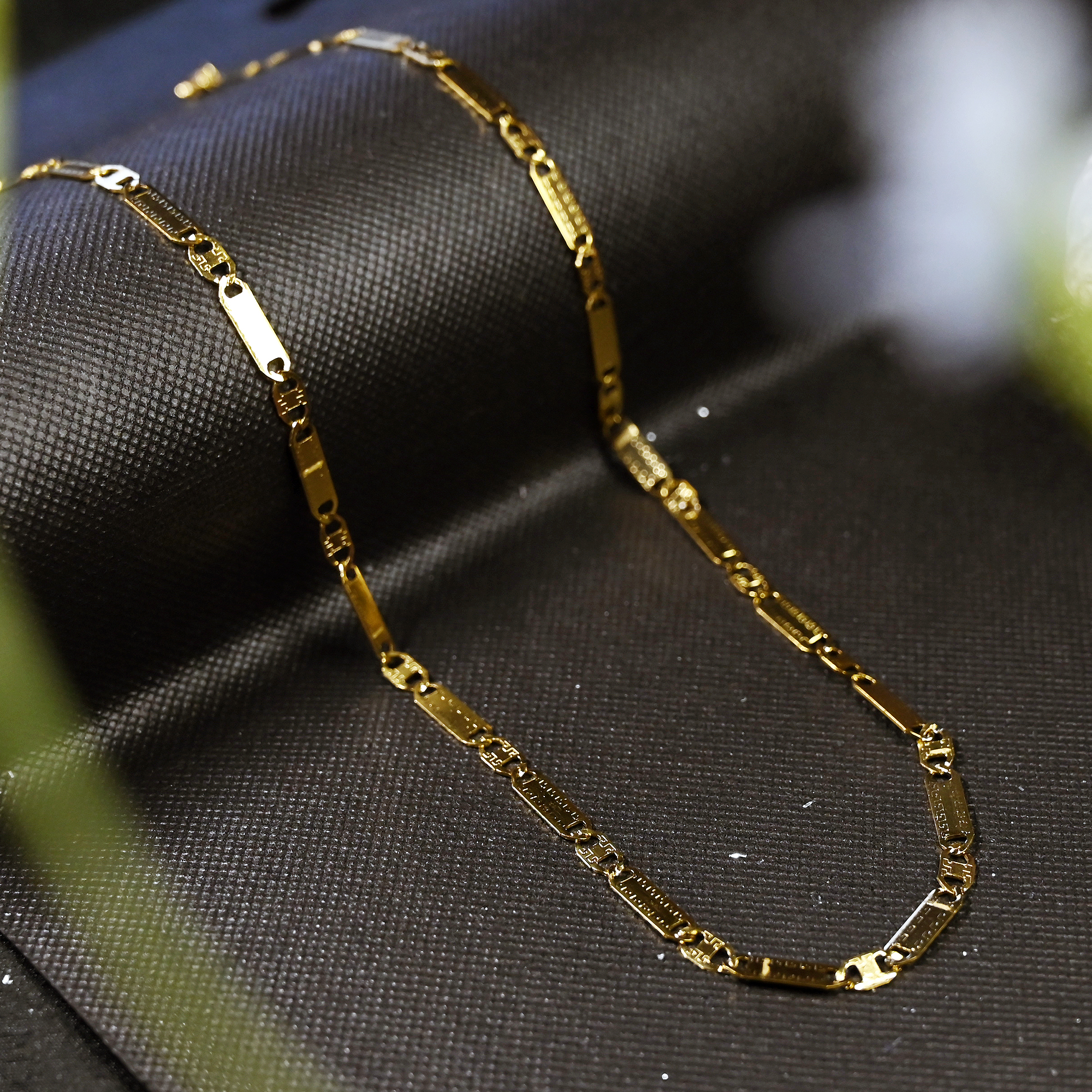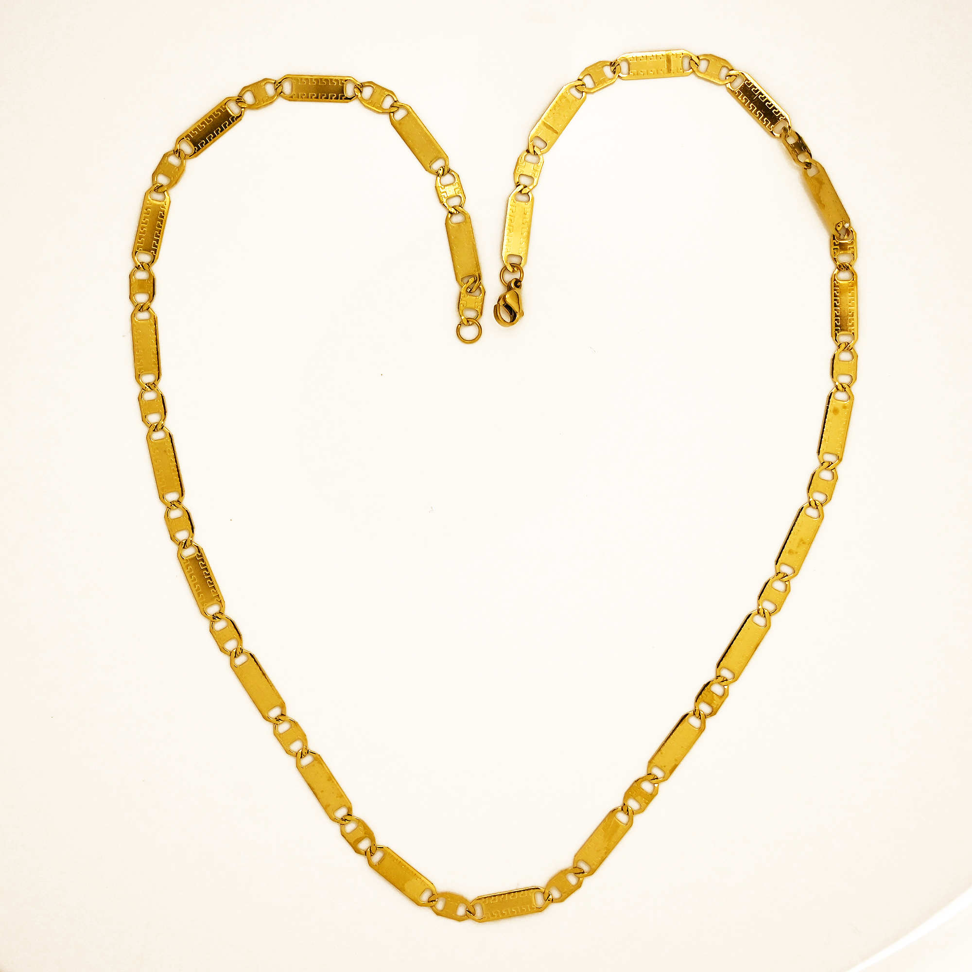 Elevate your everyday ensemble with the AuraSpark Gold Tone Biscuit Chain. Merging architectural precision with timeless luxury, this necklace features alternating high-polish rectangular bars and interlocking circular links. Crafted for those who appreciate “quiet luxury,” its sleek profile offers a bold look without being overbearing.